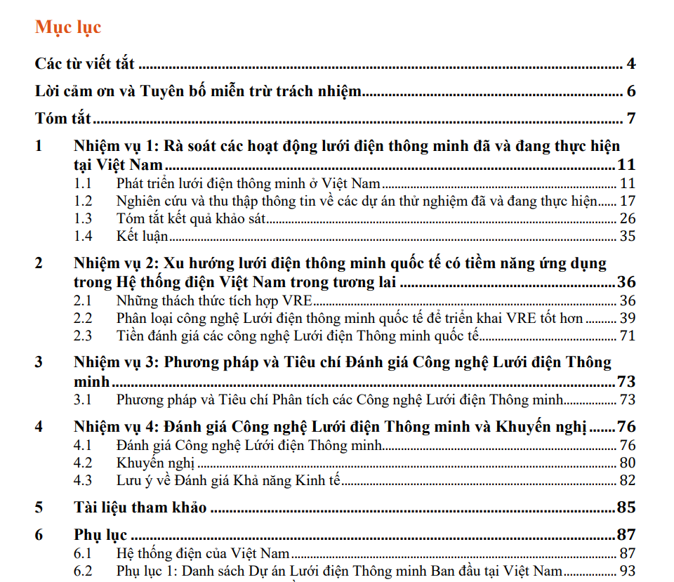 “Báo cáo đánh giá công nghệ lưới điện thông minh cho năng lượng tái tạo và hiệu quả năng lượng” trình bày rà soát các hoạt động lưới điện thông minh đã và đang thực hiện tại Việt Nam; xu hướng lưới điện thông minh quốc tế có tiềm năng ứng dụng trong hệ thống điện Việt Nam trong tương lai; phương pháp và tiêu chí đánh giá công nghệ lưới điện thông minh; đánh giá công nghệ lưới điện thông minh và khuyến nghị…