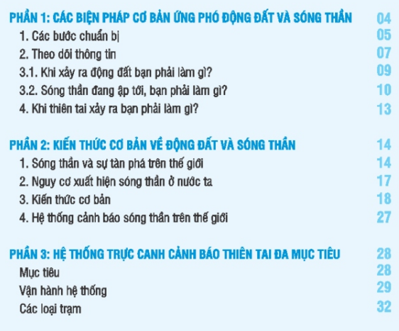 Sổ tay Phổ biến kiến thức về động đất, sóng thần trình bày các nội dung: Ứng phó khi xảy ra và sau thiên tai. Kỹ năng, kiến thức cơ bản và hệ thống cảnh báo.