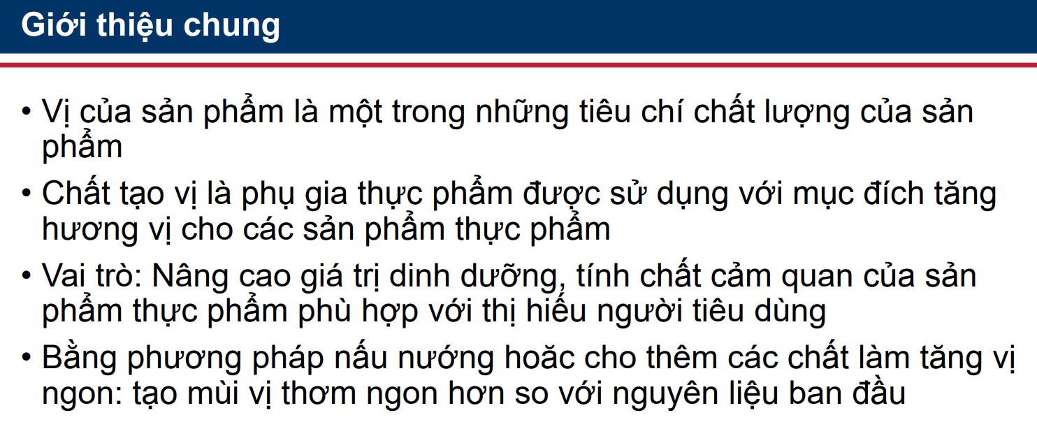 Bài giảng “Chất tạo vị” trình bày các nội dung chính sau: Giới thiệu chung về vị của sản phẩm và các chất tạo vị; Các vị cơ bản; Nhóm các chất tạo vị; Chất tạo ngọt tổng hợp; Nhóm chất gây vị chua; Nhóm chất tạo vị đắng;… Mời các bạn cùng tham khảo bài giảng.