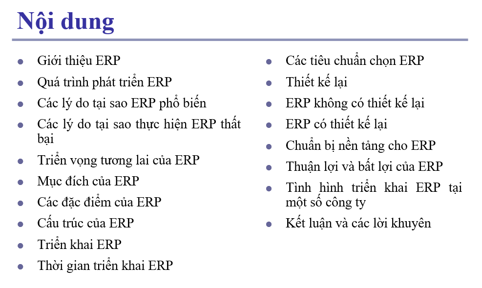 Bài giảng Hệ thống hoạch định nguồn lực doanh nghiệp trình bày các nội dung chính sau: Giới thiệu ERP; Quá trình phát triển ERP; Các lý do tại sao ERP phổ biến; Các lý do tại sao thực hiện ERP thất bại; Triển vọng tương lai của ERP; Mục đích của ERP; Các đặc điểm của ERP; Cấu trúc của ERP; Triển khai ERP; Thời gian triển khai ERP; Các tiêu chuẩn chọn ERP;…