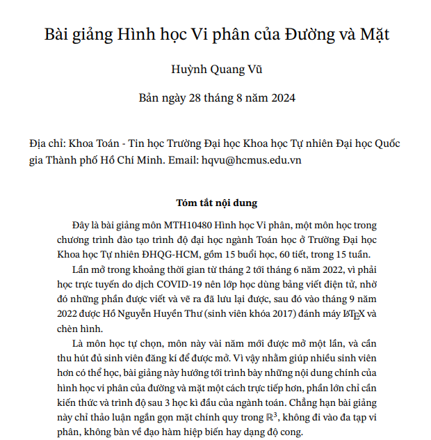 Tài liệu số Bài giảng Hình học Vi phân của Đường và Mặt