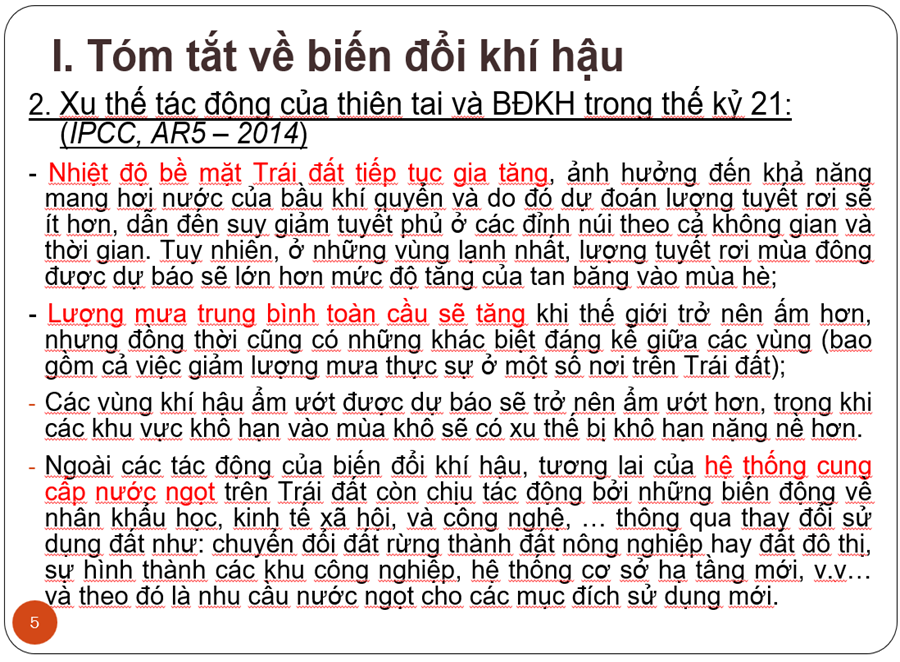 Bài giảng với các nội dung rủi ro thiên tai và thích ứng với biến đổi khí hậu, xu thế của thiên tai và biến đổi khí hậu trong thế kỷ 21, các bằng chứng về biến đổi khí hậu ở Việt Nam, cực đoan khí hậu ở Việt Nam, kịch bản biến đổi khí hậu ở Việt Nam, cực đoan khí hậu trong tương lai ở Việt Nam.