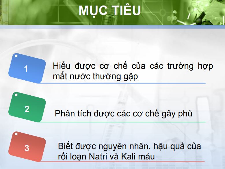 Bài giảng về rối loạn cân bằng nước-điện giải trình bày các nội dung: Cơ chế mất nước, phù, rối loạn natri, kali máu. Dành cho sinh viên Dược, Điều dưỡng, thời lượng 2 giờ.