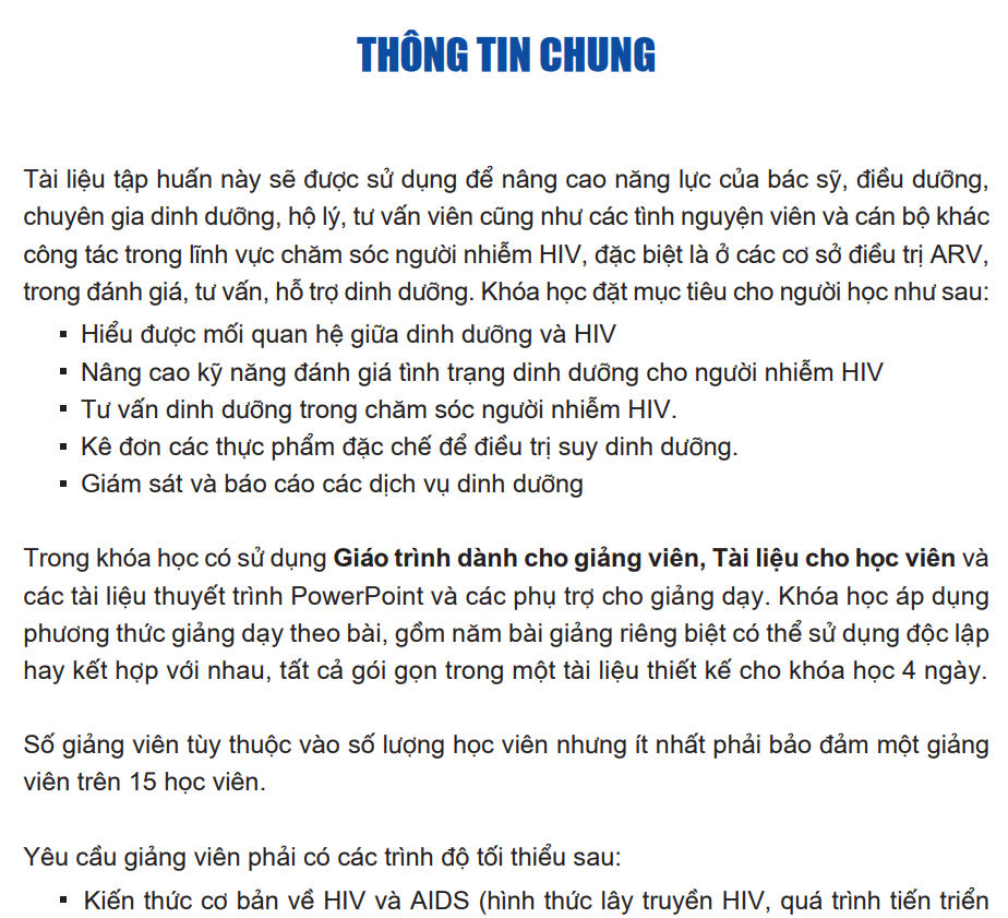 Tài liệu tập huấn này sẽ được sử dụng để nâng cao năng lực của bác sỹ, điều dưỡng, chuyên gia dinh dưỡng, hộ lý, tư vấn viên cũng như các tình nguyện viên và cán bộ khác công tác trong lĩnh vực chăm sóc người nhiễm HIV, đặc biệt là ở các cơ sở điều trị ARV, trong đánh giá, tư vấn, hỗ trợ dinh dưỡng. Mời các bạn cùng tham khảo.