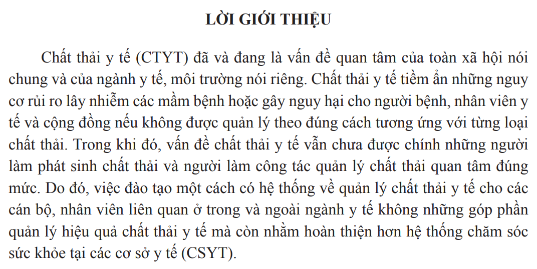 Chương trình và tài liệu đào tạo liên tục quản lý chất thải y tế cho nhân viên y tế: Phần 1 tập trung trình bày các vấn đề cơ bản về ảnh hưởng của chất thải y tế đến sức khỏe và môi trường; chính sách và văn bản pháp luật về quản lý chất thải y tế;…