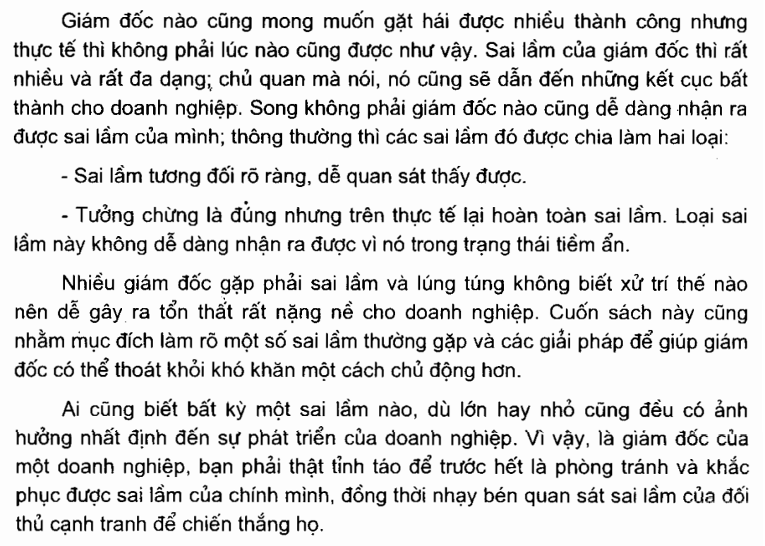 Giám đốc làm gì để không phạm sai lầm, trình bày những sai lầm trong quyết định đầu tư, huy động vốn góp,..; phát hiện, cảnh giác và phòng tránh thất bại; làm thế nào để thắng lớn khi tham gia vào thị trường cổ phiếu nhằm hướng đến mục đích là giúp các giám đốc sớm phát hiện và khắc phục những sai lầm của mình.