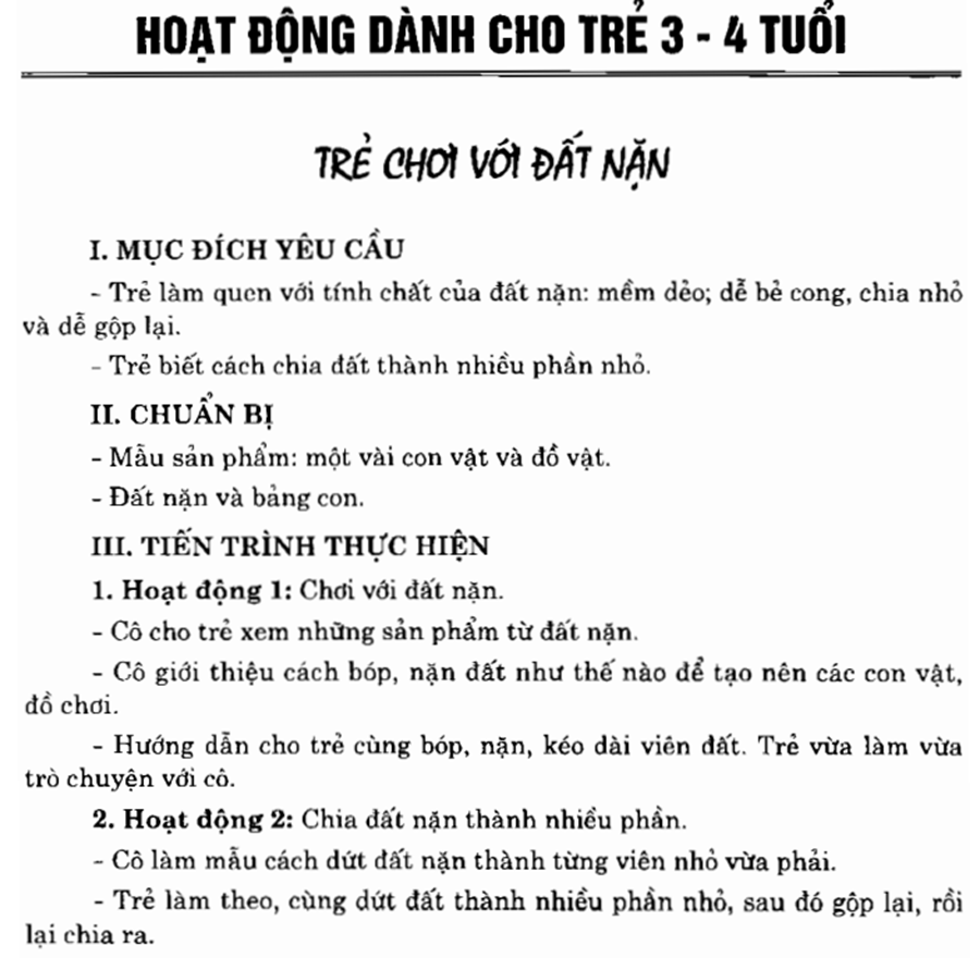 gồm có 3 phần: hoạt động dành cho trẻ 3-4 tuổi; hoạt động dành cho trẻ 4-5 tuổi; hoạt động dành cho trẻ 5-6 tuổi. Mời các bạn cùng tham khảo!