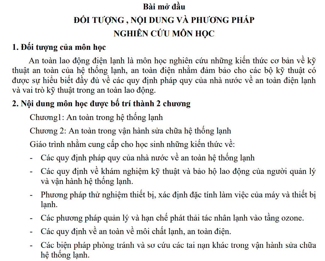 An toàn lao động điện lạnh là môn học nghiên cứu những kiến thức cơ bản về kỹ thuật an toàn của hệ thống lạnh, an toàn điện nhằm đảm bảo cho các bộ kỹ thuật có được sự hiểu biết đầy đủ về các quy định pháp quy của nhà nước về an toàn điện lạnh và vai trò kỹ thuật trong an toàn lao động. Nội dung giáo trình An toàn điện lạnh được bố trí thành 2 chương: Chương 1: An toàn trong hệ thống lạnh, Chương 2: An toàn trong vận hành sửa chữa hệ thống lạnh. Mời các bạn cùng tham khảo!