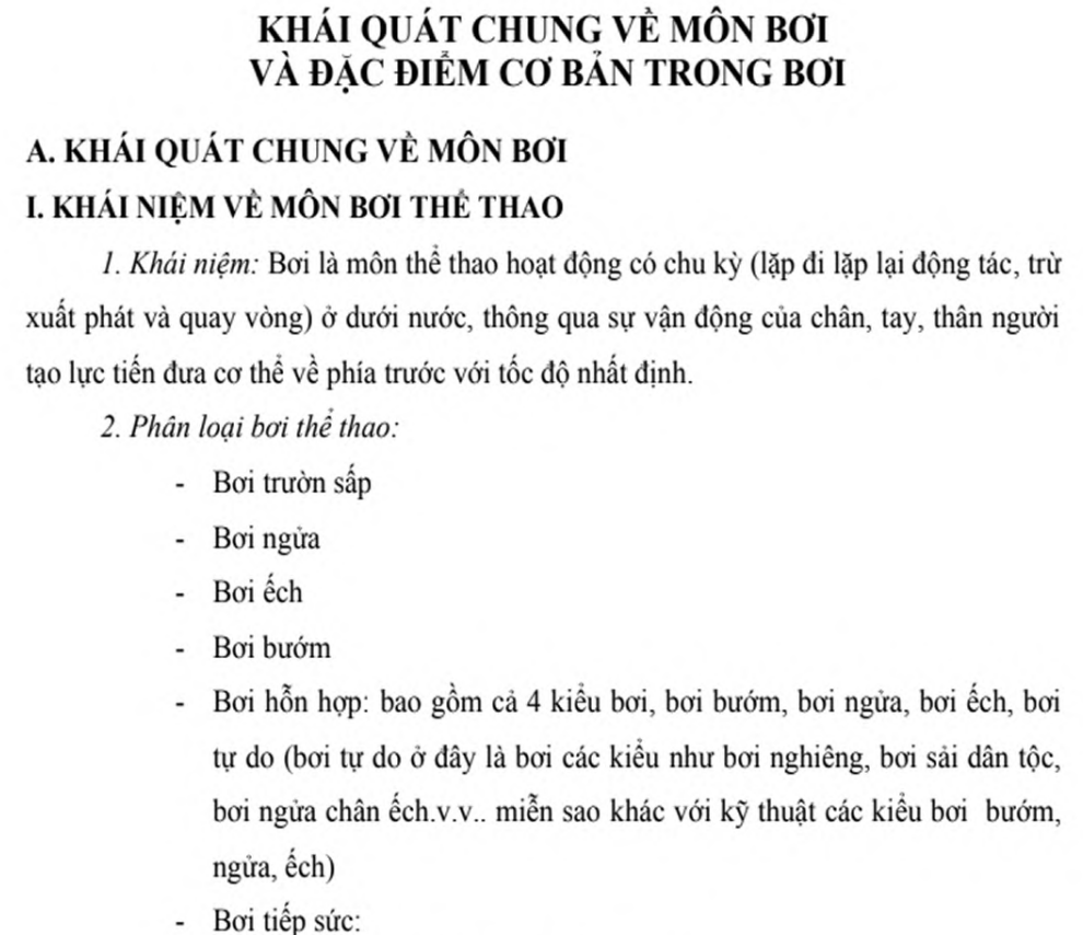 Giáo trình Bơi (Giáo trình dành cho sinh viên Đại học và Cao đẳng Thể dục Thể thao) là tài liệu chuyên sâu phục vụ công tác giảng dạy và học tập môn bơi trong các trường đào tạo thể thao. Nội dung giáo trình bao gồm kiến thức lý thuyết và kỹ thuật thực hành các kiểu bơi cơ bản như bơi ếch, bơi sải, bơi ngửa, bơi bướm, cùng phương pháp giảng dạy và huấn luyện môn bơi hiệu quả. Giáo trình còn đề cập đến các yếu tố thể lực, kỹ năng phòng tránh tai nạn dưới nước và tổ chức dạy học bơi trong nhà trường. Mời các bạn cùng tham khảo giáo trình để nâng cao kỹ năng chuyên môn và phương pháp giảng dạy môn bơi.