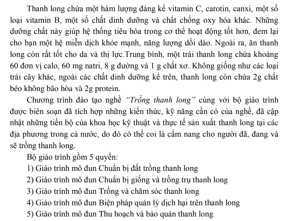 Có những kiến thức cơ bản về các bước trong công việc chọn giống, nhân giống và trồng trụ thanh long đúng kỹ thuật theo đúng trình tự, đảm bảo yêu cầu kỹ thuật, an toàn, phát hiện và xử lý các hiện tượng bất thường trong quá trình trồng.