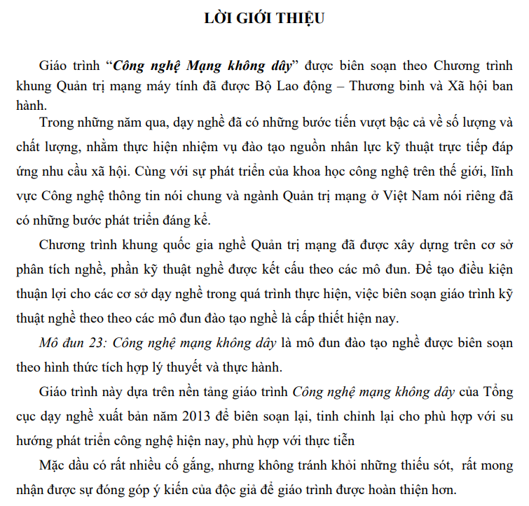 Giáo trình Công nghệ mạng không dây trình bày tổng quan, kiến trúc, bảo mật WLAN, cấu hình Router TP-Link/Cisco. Bài tập thực hành ADHOC, quản trị mạng.