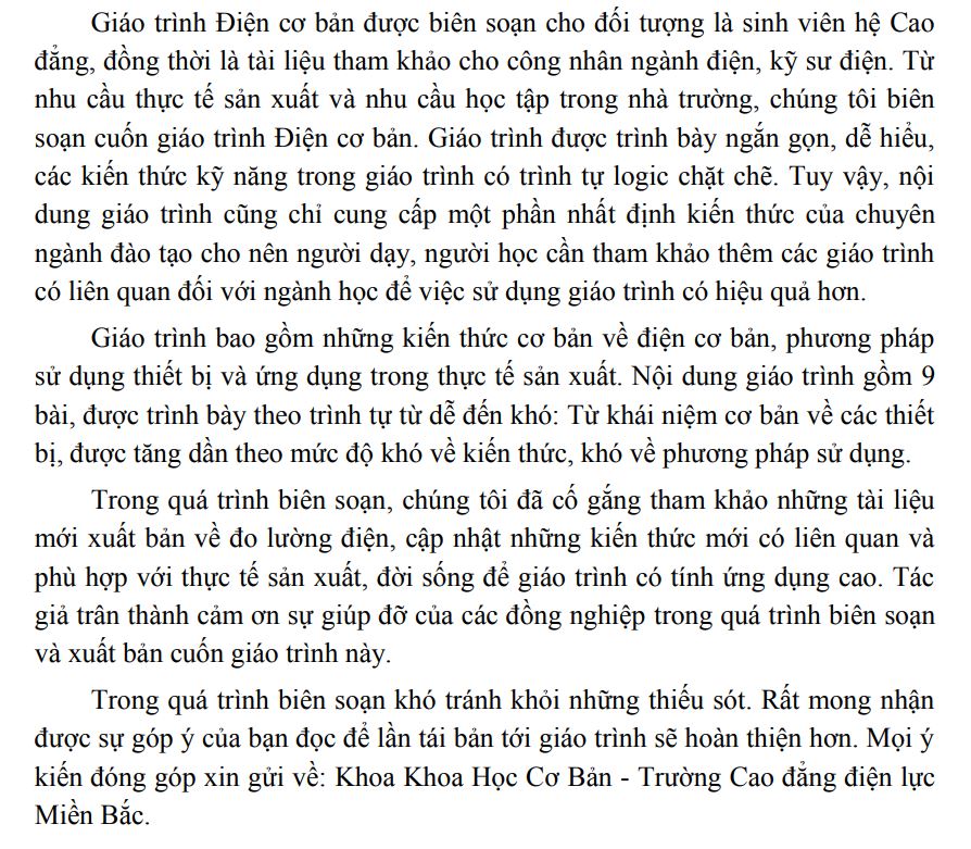 Giáo trình Điện cơ bản (Ngành: Quản lý vận hành, sửa chữa đường dây và trạm biến áp có điện áp 110kV trở xuống – Trình độ: Cao đẳng) – Trường Cao đẳng Điện lực miền Bắc bao gồm những kiến thức cơ bản về điện cơ bản, phương pháp sử dụng thiết bị và ứng dụng trong thực tế sản xuất. Nội dung giáo trình gồm 9 bài, được trình bày theo trình tự từ dễ đến khó: Từ khái niệm cơ bản về các thiết bị, được tăng dần theo mức độ khó về kiến thức, khó về phương pháp sử dụng.