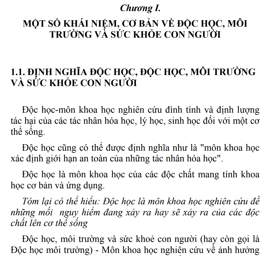 Nội dung của giáo trình được thể hiện qua 6 chương: Chương 1 – Một số khái niệm về độc học, môi trường và sức khoẻ con người; Chương 2 – Các dạng độc chất; chương 3 – Sự hấp thụ, phân bố và đào thải; chương 4 – Các yếu tố ảnh hưởng đến độc tính; chương 5 – Đánh giá độ an toàn; chương 6 – Đánh giá nguy cơ của độc chất; chương 7 – ảnh hưởng của một số chất nguy hại tới sức khoẻ con người.