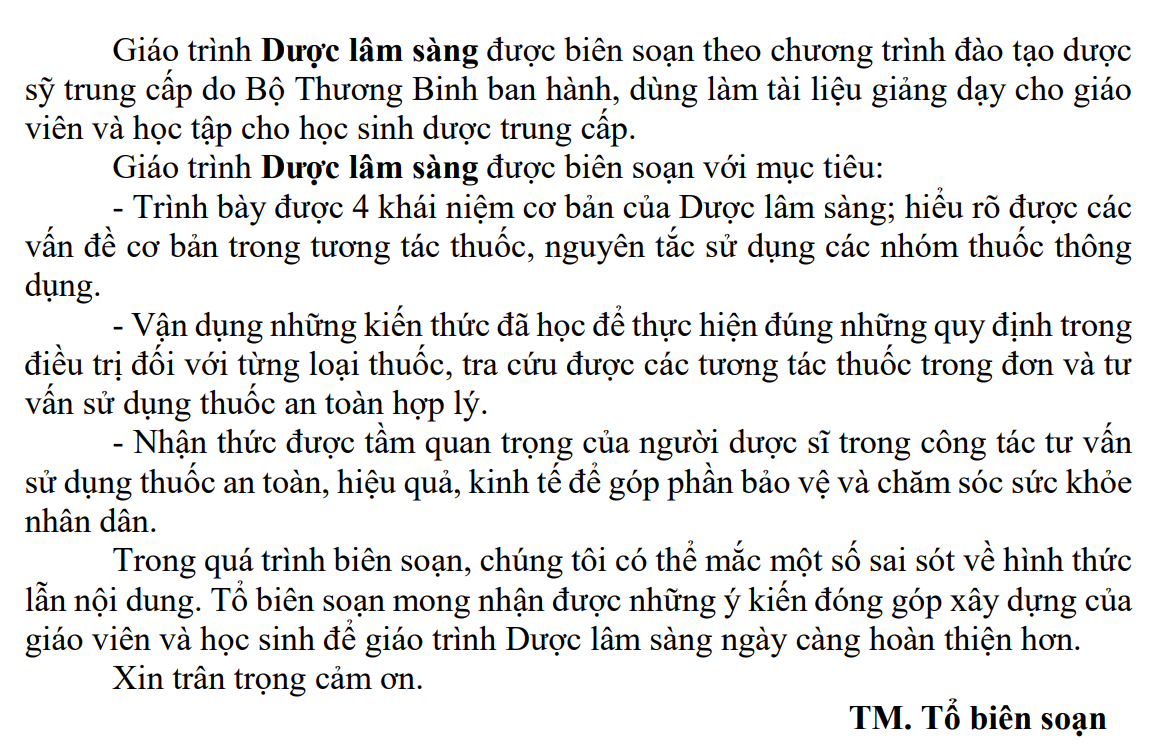 Giáo trình có những nội dung chính như sau: Đại cương về dược lâm sàng; Các thông số dược động học ứng dụng trong lâm sàng; Tương tác thuốc; Phản ứng bất lợi của thuốc và cảnh giác thuốc; Thông tin thuốc; Xét nghiệm lâm sàng và nhận định kết quả; Sử dụng thuốc cho các đối tượng đặc biệt; Nguyên tắc sử dụng thuốc kháng sinh và kháng khuẩn; Nguyên tắc sử dụng vitamin và chất khoáng; Nguyên tắc sử dụng thuốc chống viêm an toàn hợp lý;…