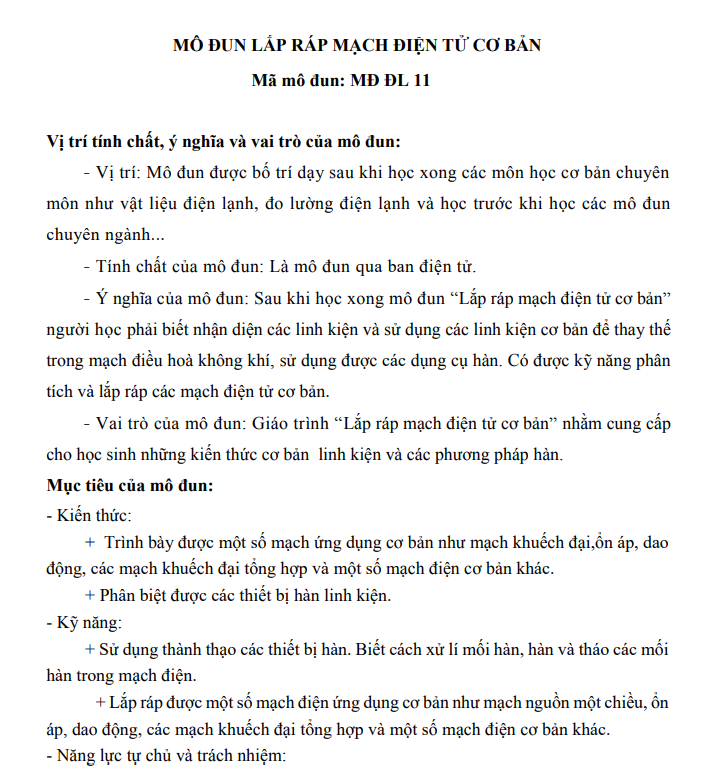 Sau khi học xong giáo trình Lắp ráp mạch điện tử cơ bản người học phải biết nhận diện các linh kiện và sử dụng các linh kiện cơ bản để thay thế trong mạch điều hoà không khí, sử dụng được các dụng cụ hàn. Có được kỹ năng phân tích và lắp ráp các mạch điện tử cơ bản.