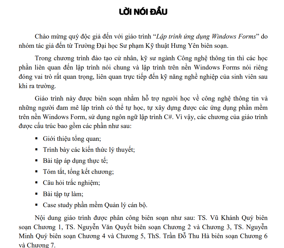 Nội dung được trình bày từ tổng quan .NET Framework, môi trường Visual Studio đến cách thao tác với Form và các điều khiển cơ bản như Label, TextBox, Button, CheckBox, RadioButton. Sách cũng hướng dẫn làm việc với các điều khiển nâng cao như Timer, GroupBox, Panel, TabControl và các điều khiển tập hợp (ComboBox, ListBox). Mỗi chương đều có lý thuyết, ví dụ minh họa, bài tập áp dụng và câu hỏi trắc nghiệm để rèn luyện kỹ năng. Giáo trình còn đưa vào các case study phần mềm quản lý, giúp người học tiếp cận ứng dụng thực tế. Đây là tài liệu hữu ích cho sinh viên và người tự học công nghệ thông tin muốn phát triển kỹ năng lập trình ứng dụng.