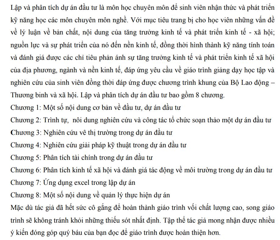 Giáo trình Lập và phân tích dự án đầu tư là tài liệu chuyên sâu dành cho sinh viên, cán bộ quản lý và nhà đầu tư nghiên cứu về quá trình xây dựng và đánh giá hiệu quả dự án. Nội dung giáo trình đề cập toàn diện đến các giai đoạn như khảo sát tiền khả thi, phân tích tài chính, phân tích kinh tế xã hội, đánh giá rủi ro và tổ chức thực hiện dự án. Giáo trình cung cấp kiến thức nền tảng cũng như kỹ năng ứng dụng thực tế trong việc ra quyết định đầu tư. Mời các bạn cùng tham khảo giáo trình để nâng cao năng lực lập kế hoạch và thẩm định dự án đầu tư.