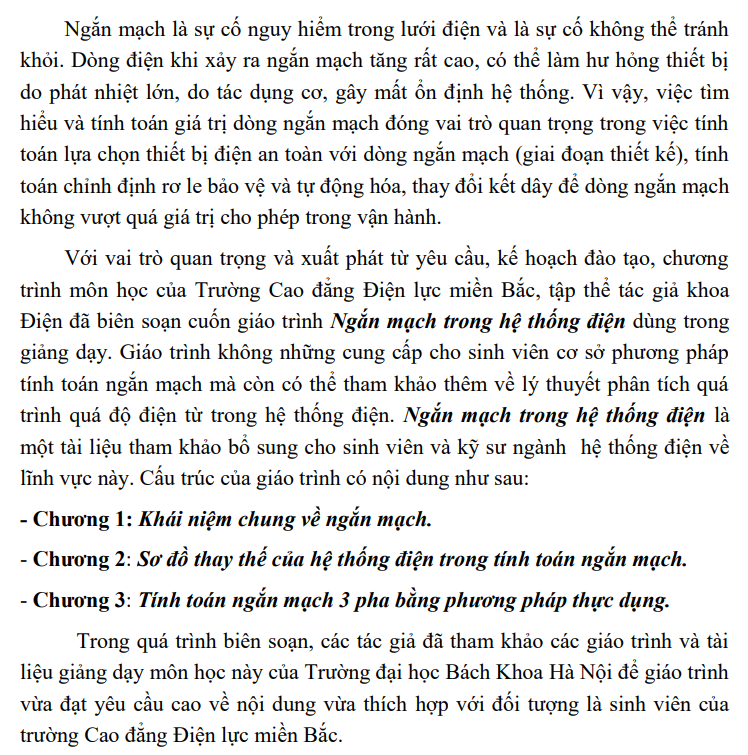 Giáo trình Ngắn mạch trong hệ thống điện (Ngành: Quản lý vận hành, sửa chữa đường dây và trạm biến áp có điện áp 110kV trở xuống – Trình độ: Cao đẳng) – Trường Cao đẳng Điện lực miền Bắc gồm các nội dung: Khái niệm chung về ngắn mạch; Sơ đồ thay thế của hệ thống điện trong tính toán ngắn mạch; Tính toán ngắn mạch 3 pha bằng phương pháp thực dụng..
