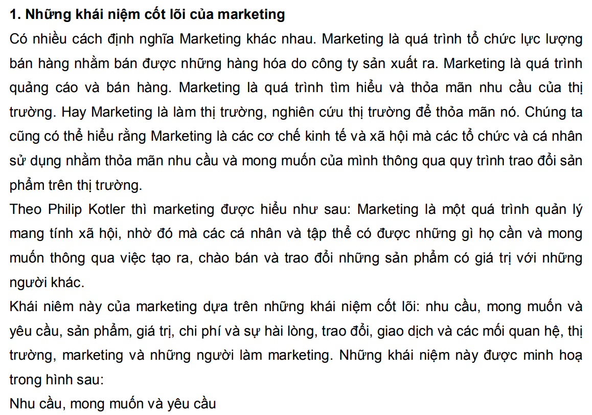 Tài liệu nhằm mục đích hỗ trợ việc học tập cho sinh viên môn Quản trị Marketing. Có nhiều cách định nghĩa Marketing khác nhau. Marketing là quá trình tổ chức lực lượng bán hàng nhằm bán được những hàng hóa do công ty sản xuất ra….