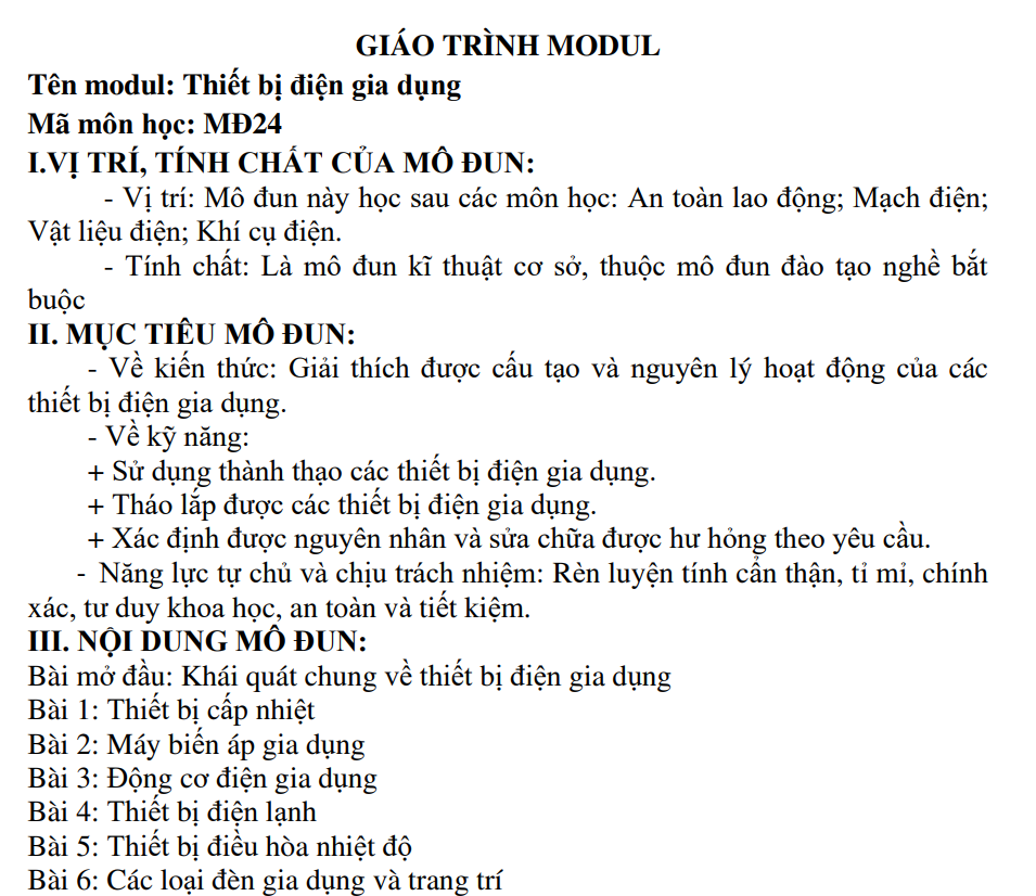 Giáo trình Thiết bị điện gia dụng (Ngành/nghề: Điện công nghiệp) gồm có những nội dung chính sau: Bài mở đầu: Khái quát chung về thiết bị điện gia dụng; Bài 1: Thiết bị cấp nhiệt; Bài 2: Máy biến áp gia dụng; Bài 3: Động cơ điện gia dụng; Bài 4: Thiết bị điện lạnh; Bài 5: Thiết bị điều hòa nhiệt độ; Bài 6: Các loại đèn gia dụng và trang trí. Mời các bạn cùng tham khảo!