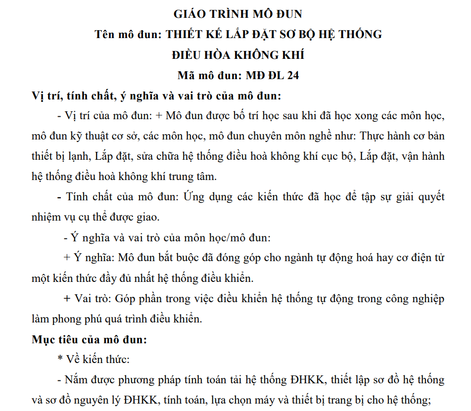Tài liệu số Giáo trình Thiết kế lắp đặt sơ bộ hệ thống điều hòa không khí