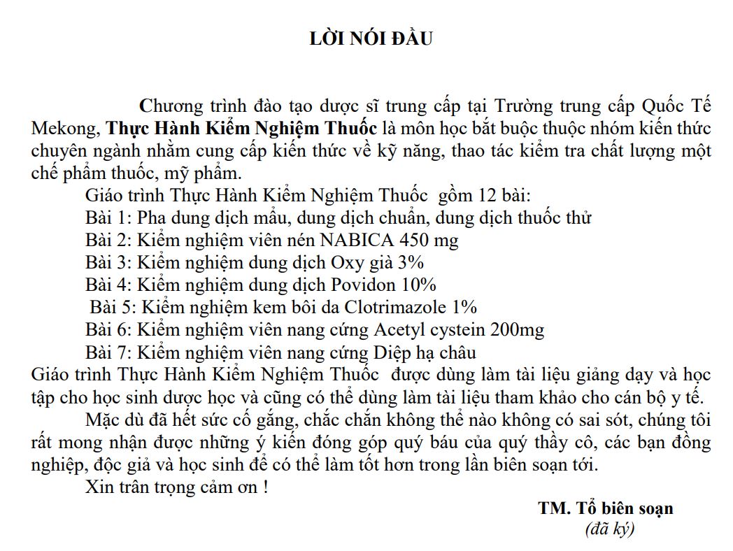 Giáo trình Thực hành kiểm nghiệm thuốc (Ngành: Dược sĩ – Trình độ: Trung cấp) – Trường Trung cấp Quốc tế Mekong gồm những nội dung chính như sau: Pha dung dịch mẩu, dung dịch chuẩn, dung dịch thuốc thử; Kiểm nghiệm viên nén NABICA 450 mg; Kiểm nghiệm dung dịch Oxy già 3%; Kiểm nghiệm dung dịch Povidon 10%; Kiểm nghiệm kem bôi da Clotrimazole 1%; Kiểm nghiệm viên nang cứng Acetyl cystein 200mg; Kiểm nghiệm viên nang cứng Diệp hạ châu.