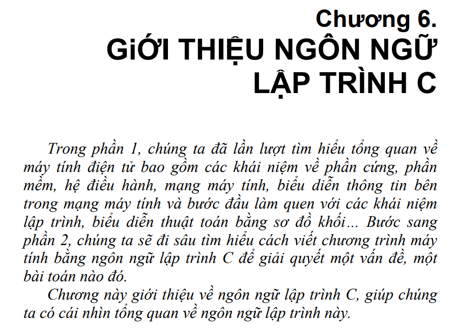 Trong phần 1, chúng ta đã lần lượt tìm hiểu tổng quan về máy tính điện tử bao gồm các khái niệm về phần cứng, phần mềm, hệ điều hành, mạng máy tính, biểu diễn thông tin bên trong mạng máy tính và bước đầu làm quen với các khái niệm lập trình, biểu diễn thuật toán bằng sơ đồ khối… Chương này giới thiệu về ngôn ngữ lập trình C, giúp chúng ta có cái nhìn tổng quan về ngôn ngữ lập trình này….