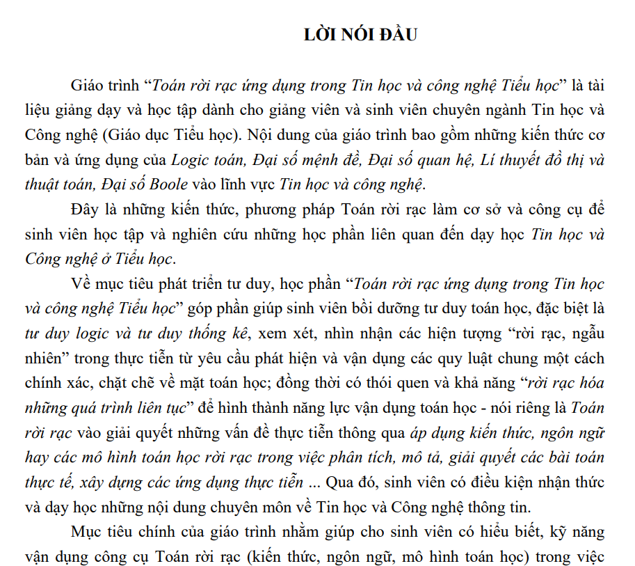 Giáo trình Toán rời rạc ứng dụng trong Tin học và công nghệ Tiểu học: Phần 1 cung cấp cho người đọc những kiến thức như: Mệnh đề và các phép toán mệnh đề; Quy tắc suy diễn; Vị từ và lượng từ; Nguyên lí quy nạp; Quan hệ hai ngôi; Quan hệ tương đương;…Mời các bạn cùng tham khảo!