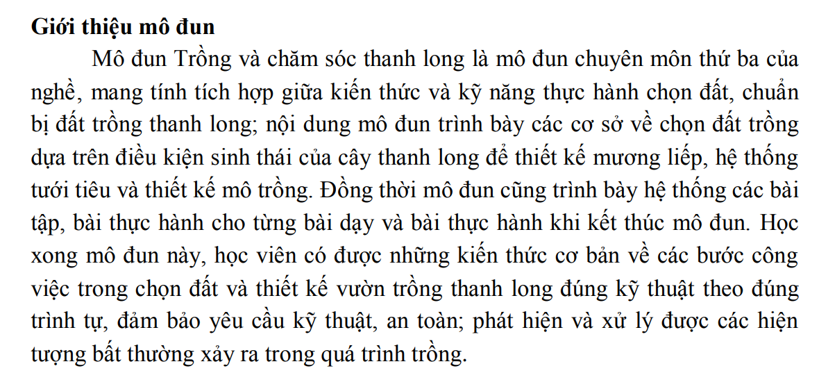 Giáo trình này giúp học viên có kiến thức cơ bản về các bước công việc trong chọn đất và thiết kế vườn trồng thanh long đúng kỹ thuật theo đúng trình tự, đảm bảo yêu cầu kỹ thuật, an toàn, phát hiện và xử lý được các hiện tượng bát thường xảy ra trong quá trình trồng.