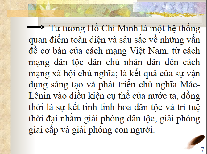 Tư tưởng Hồ Chí Minh là một hệ thống quan điểm toàn diện và sâu sắc về những vấn đề cơ bản của cách mạng Việt Nam, từ cách mạng dân tộc dân chủ nhân dân đến cách mạng xã hội chủ nghĩa; là kết quả của sự vận dụng sáng tạo và phát triển chủ nghĩa Mác- Lênin vào điều kiện cụ thể của nước ta, đồng thời là sự kết tinh tinh hoa dân tộc và trí tuệ thời đại nhằm giải phóng dân tộc, giải phóng giai cấp và giải phóng con người….