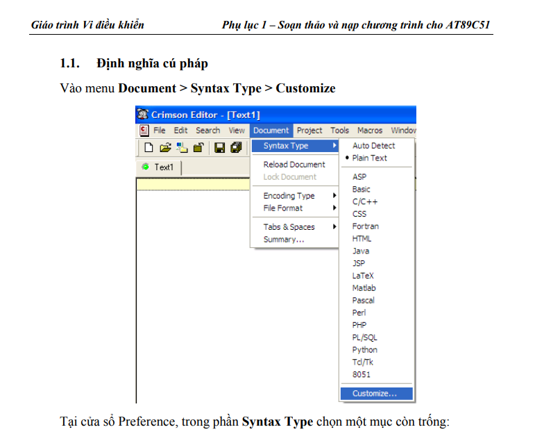 Soạn thảo chương trình Soạn thảo chương trình cho AT89C51 có thể dùng nhiều chương trình khác nhau. Phần phụ lục này giới thiệu một chương trình cho phép soạn thảo bằng hợp ngữ: Crimson Editor.