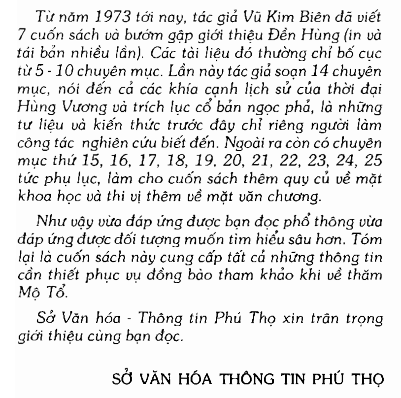 Sách “Giới thiệu khu di tích lịch sử Đền Hùng” sẽ vừa đáp ứng được bạn đọc phổ thông, vừa đáp ứng được đối tượng muốn tìm hiểu sâu hơn. Tóm lại ebook này cung cấp tất cả những thông tin cần thiết phục vụ đồng bào tham khảo khi về thăm Mộ Tổ.