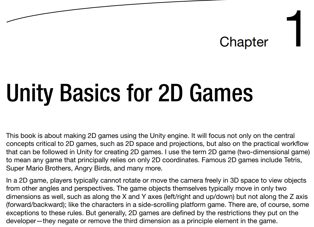 This book is about making 2D games using the Unity engine. It will focus not only on the central concepts critical to 2D games, such as 2D space and projections, but also on the practical workflow that can be followed in Unity for creating 2D games. This book included 13 chapter and are devided 2 part, part 1 provide content: Unity basics for 2D games, materials and textures, quick 2D workflow, customizing the editor with editor classes, procedural geometry and textured quads, generating atlas textures.