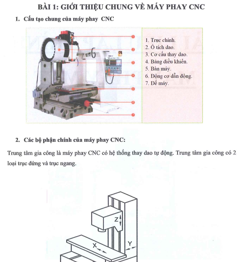 Tài liệu hướng dẫn lập trình máy phay CNC, cấu tạo, bộ phận (trục chính, bàn máy, thay dao), bảng điều khiển, và đặc tính kỹ thuật.