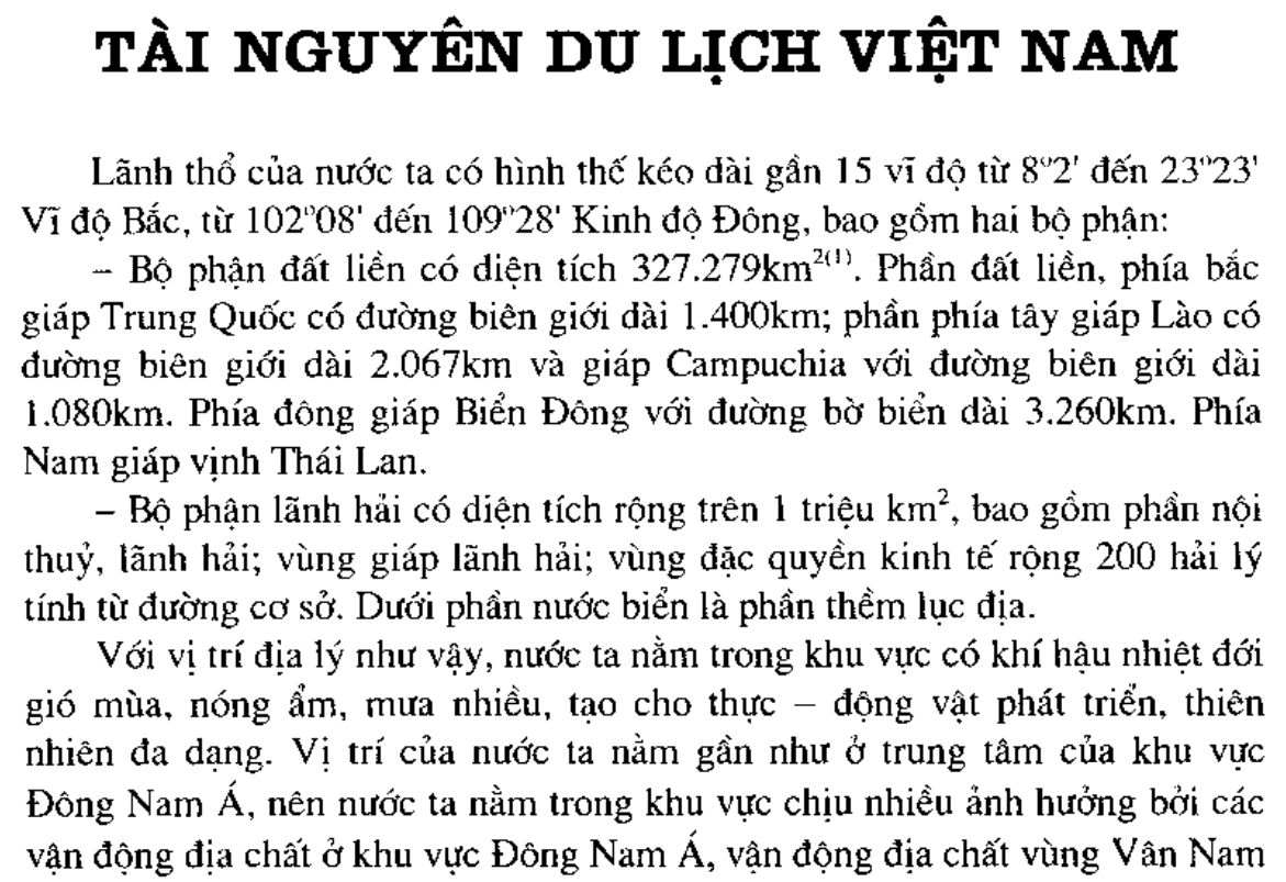Phần 2 cuốn sách “Tài nguyên du lịch” của hai tác giả Bùi Thị Hải Yến (chủ biên) và Phạm Hồng Long gồm nội dung 4 chương đầu tài liệu, trình bày gồm nội dung chương 5 – Tài nguyên du lịch Việt Nam và chương 6 – Các vườn quốc gia Việt Nam.